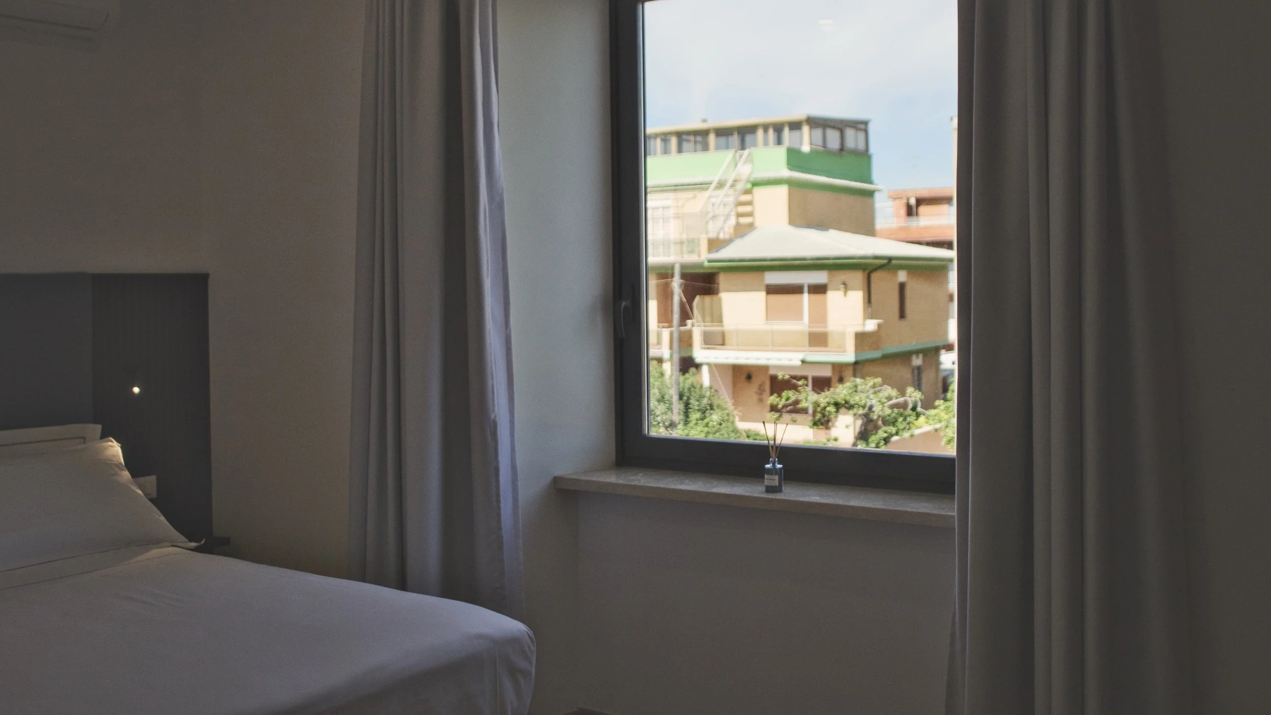 Essenziale e curata, con vista città. Una camera dal comfort contemporaneo, pensata per soggiorni pratici e rilassati.